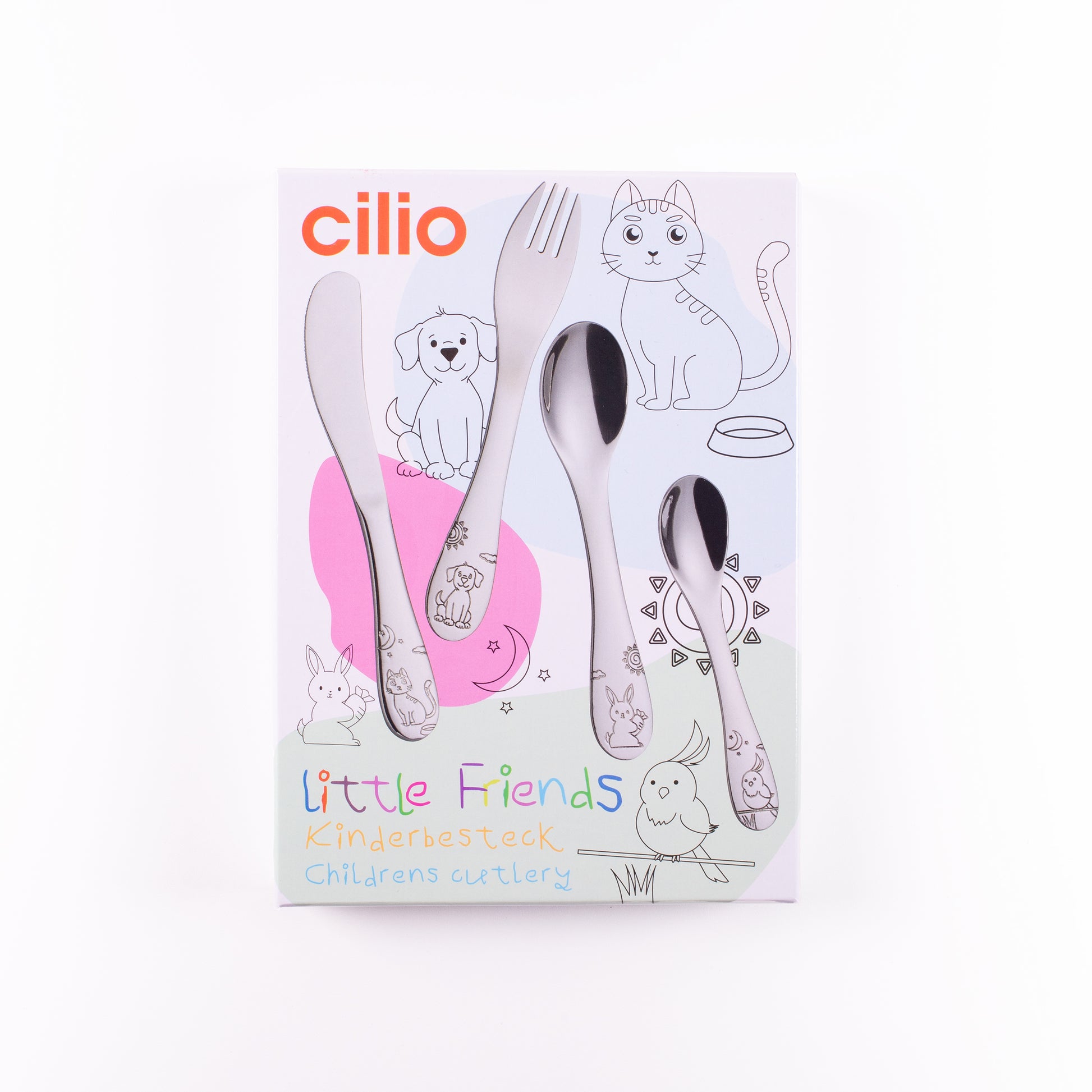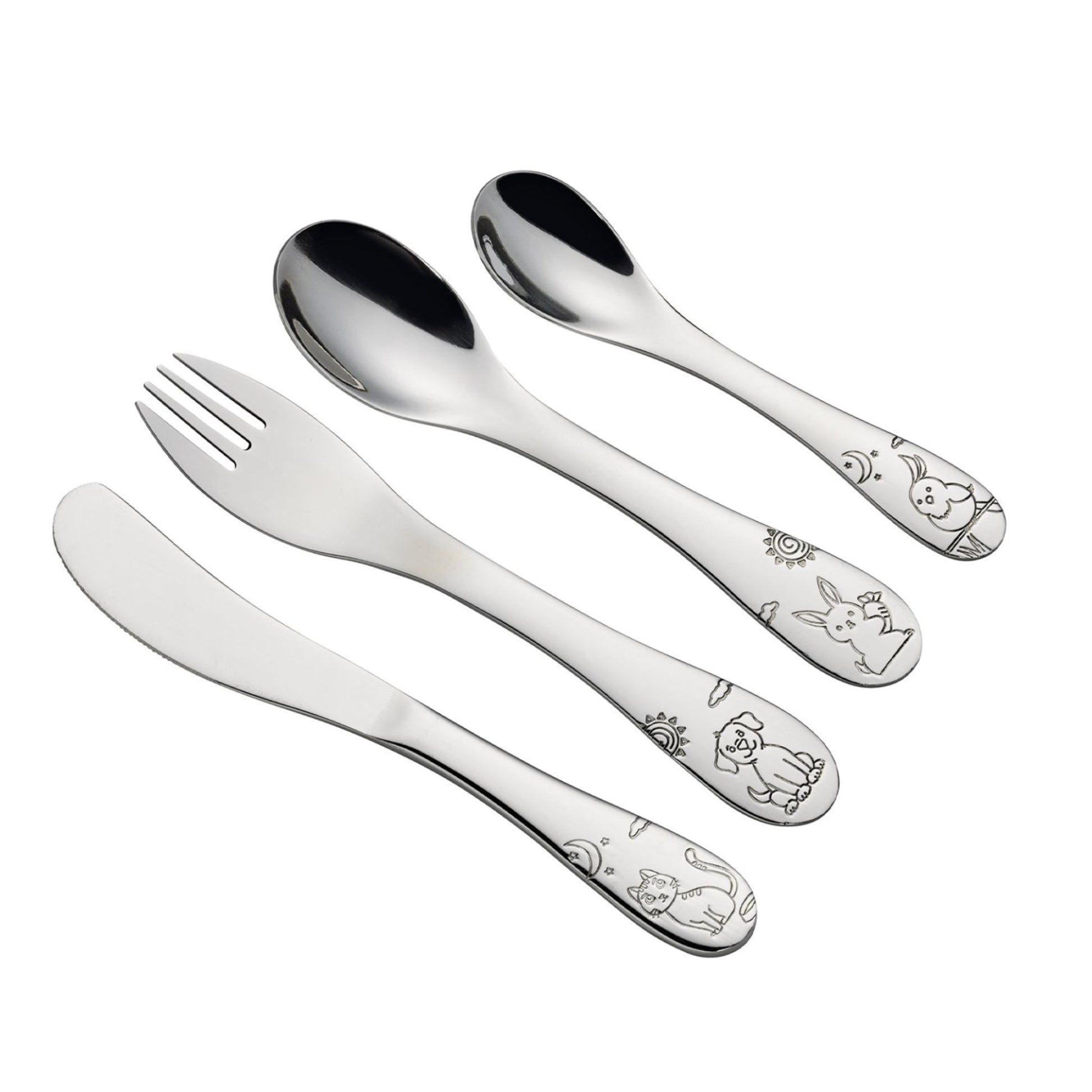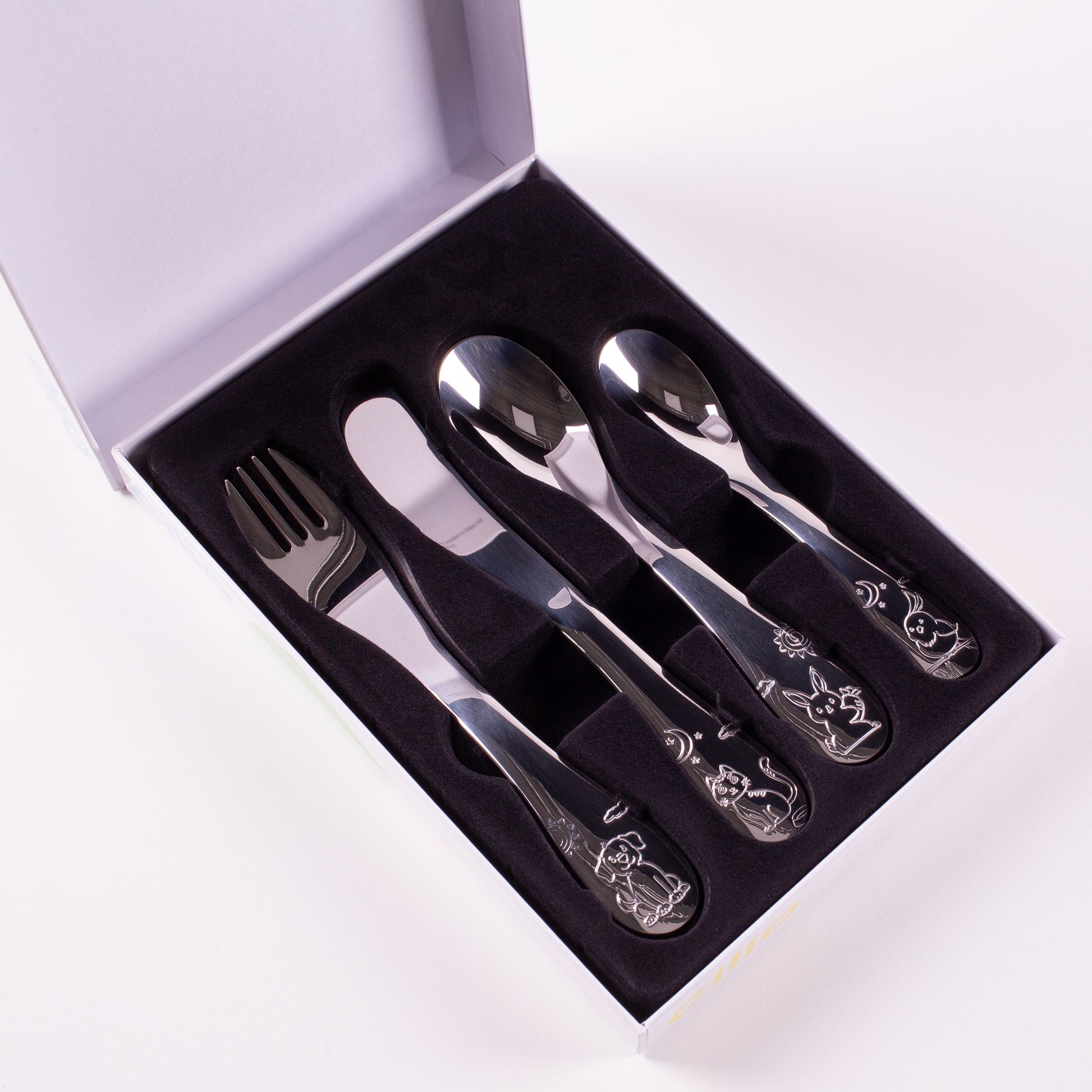 • Set de 4 pièces : couteau, fourchette, cuillère et petite cuillère